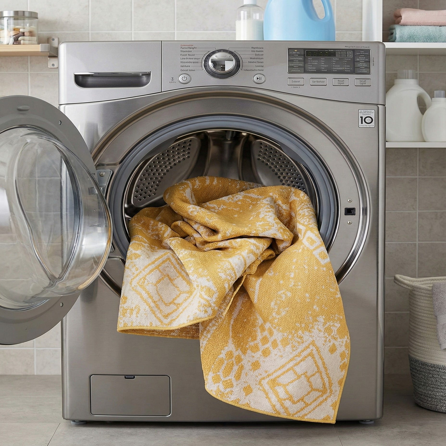 Primary color is Yellow. Colors in this rug include: Yellow, Ivory.