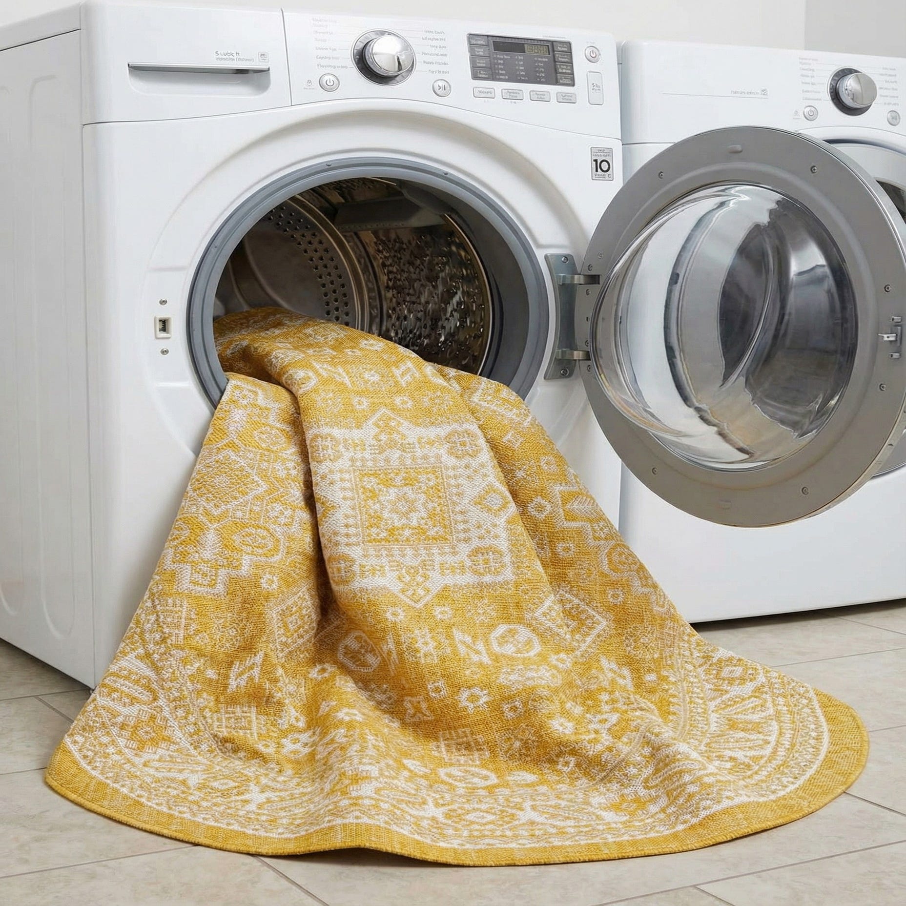 Primary color is Yellow. Colors in this rug include: Yellow, Ivory.