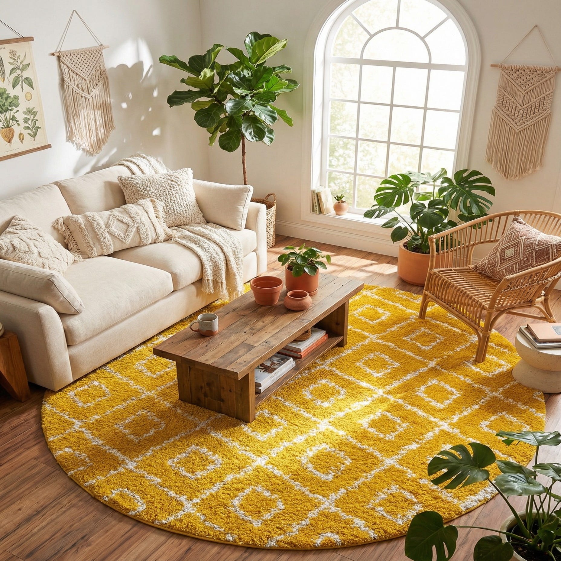 Primary color is Yellow. Colors in this rug include: Yellow, Ivory.