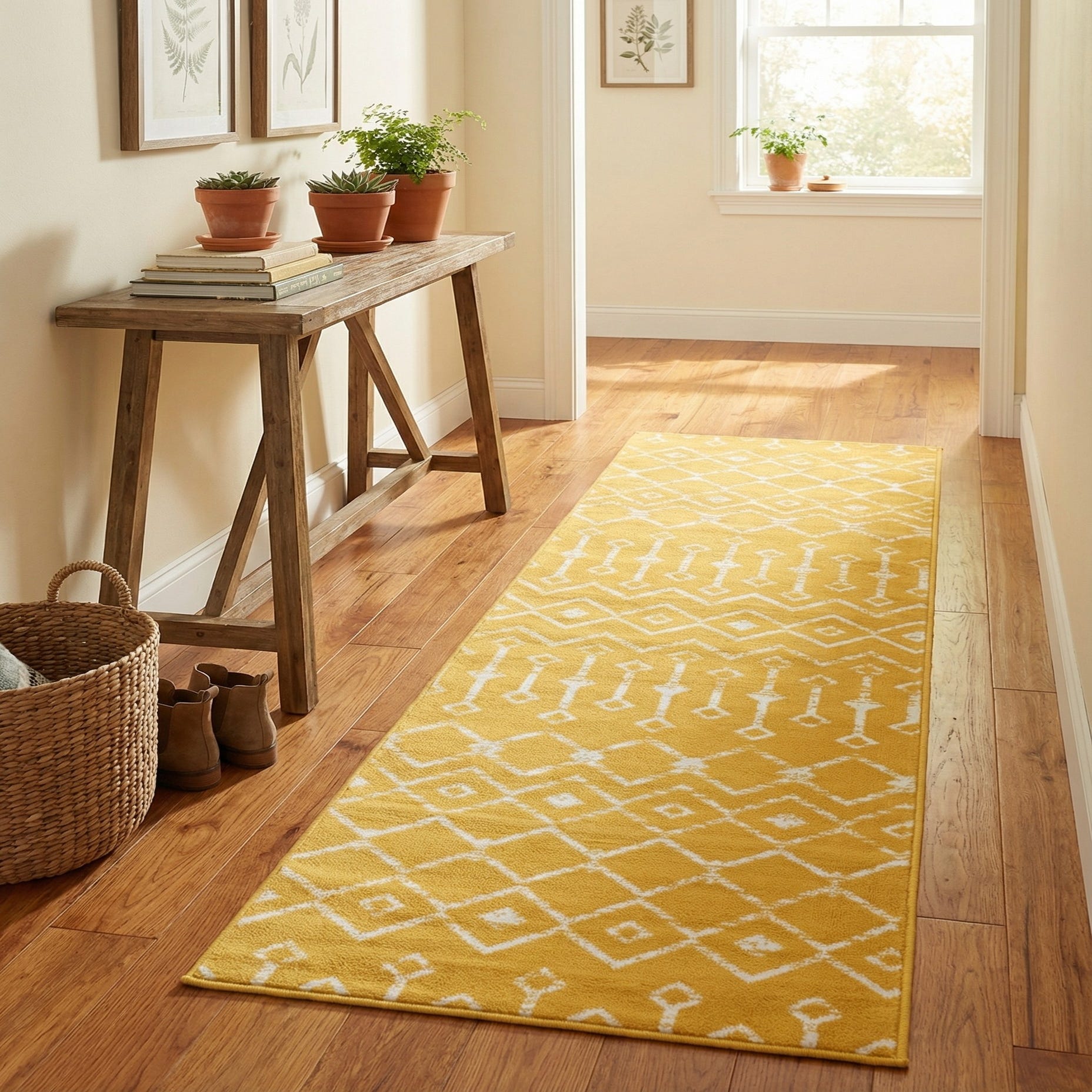 Primary color is Yellow. Colors in this rug include: Yellow, Ivory.