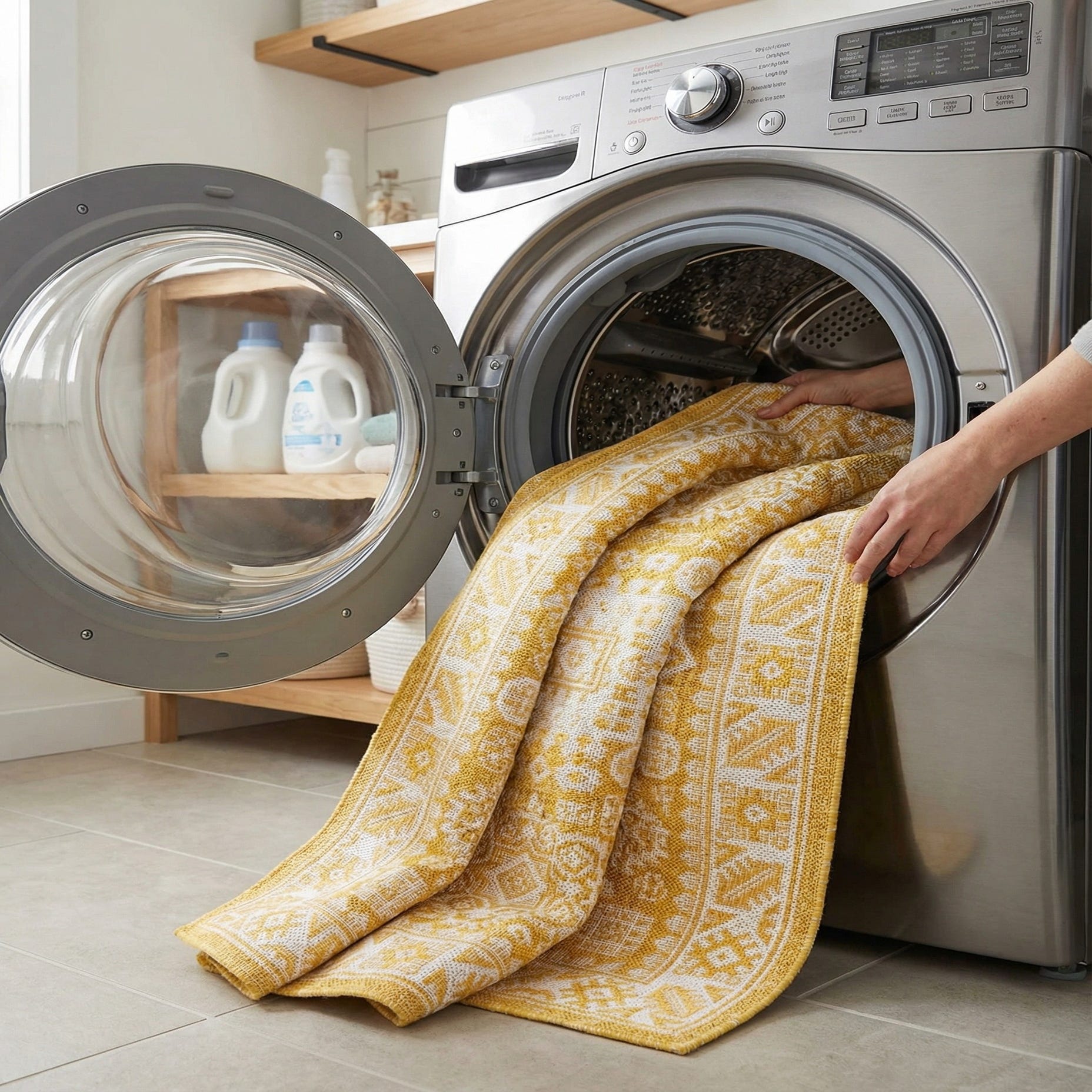 Primary color is Yellow. Colors in this rug include: Yellow, Ivory.