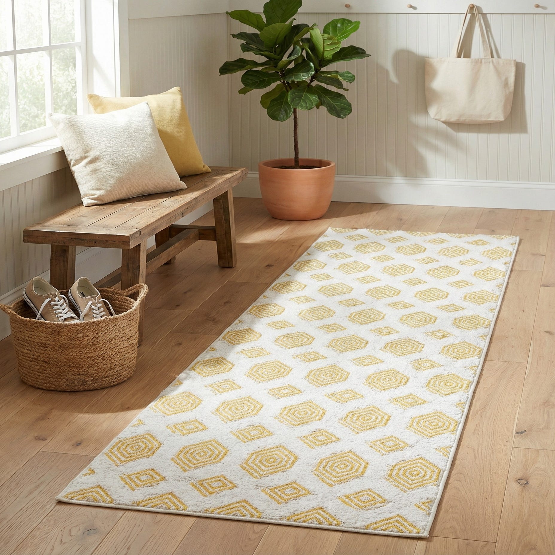 Primary color is Yellow. Colors in this rug include: Yellow, Ivory.