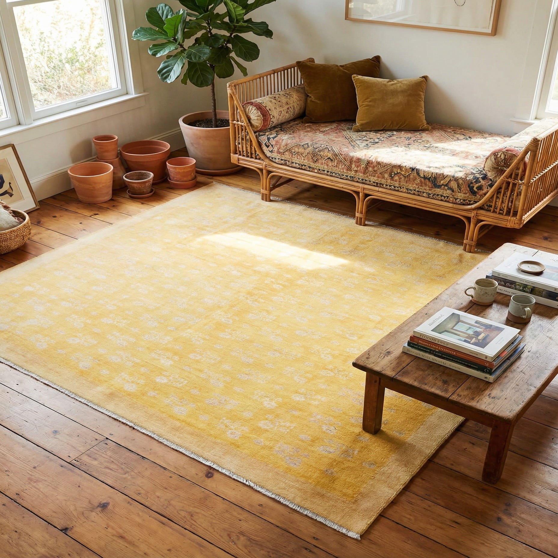 Primary color is Yellow. Colors in this rug include: Yellow, Beige.