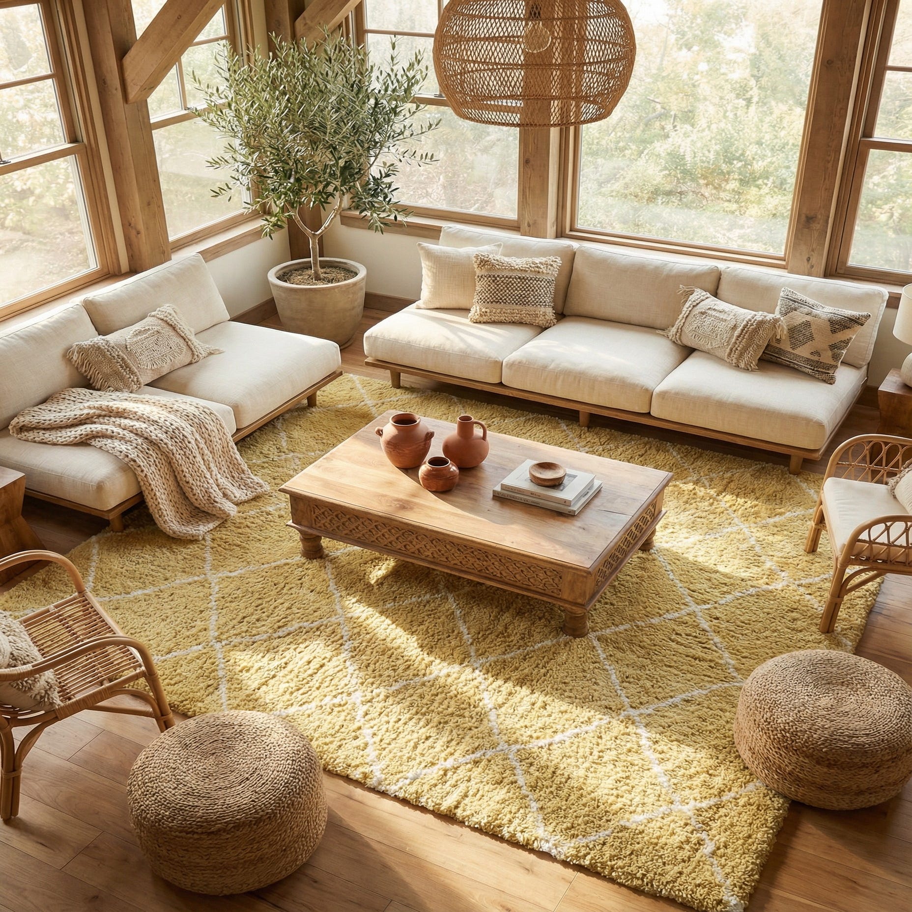 Primary color is Yellow. Colors in this rug include: Yellow, Ivory.