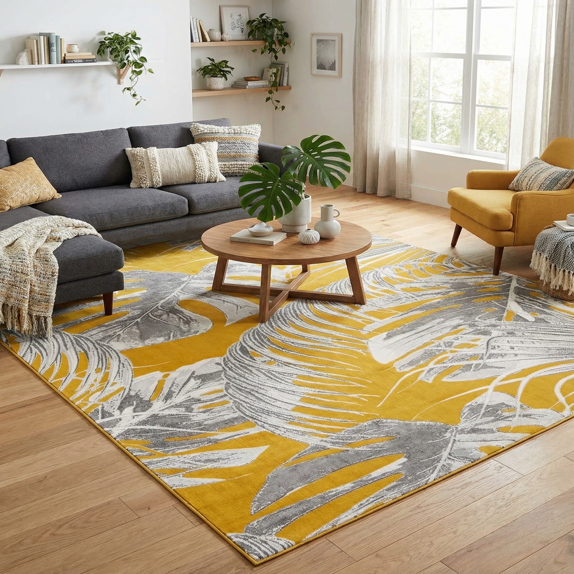Primary color is Yellow. Colors in this rug include: Yellow, Gray, Ivory.
