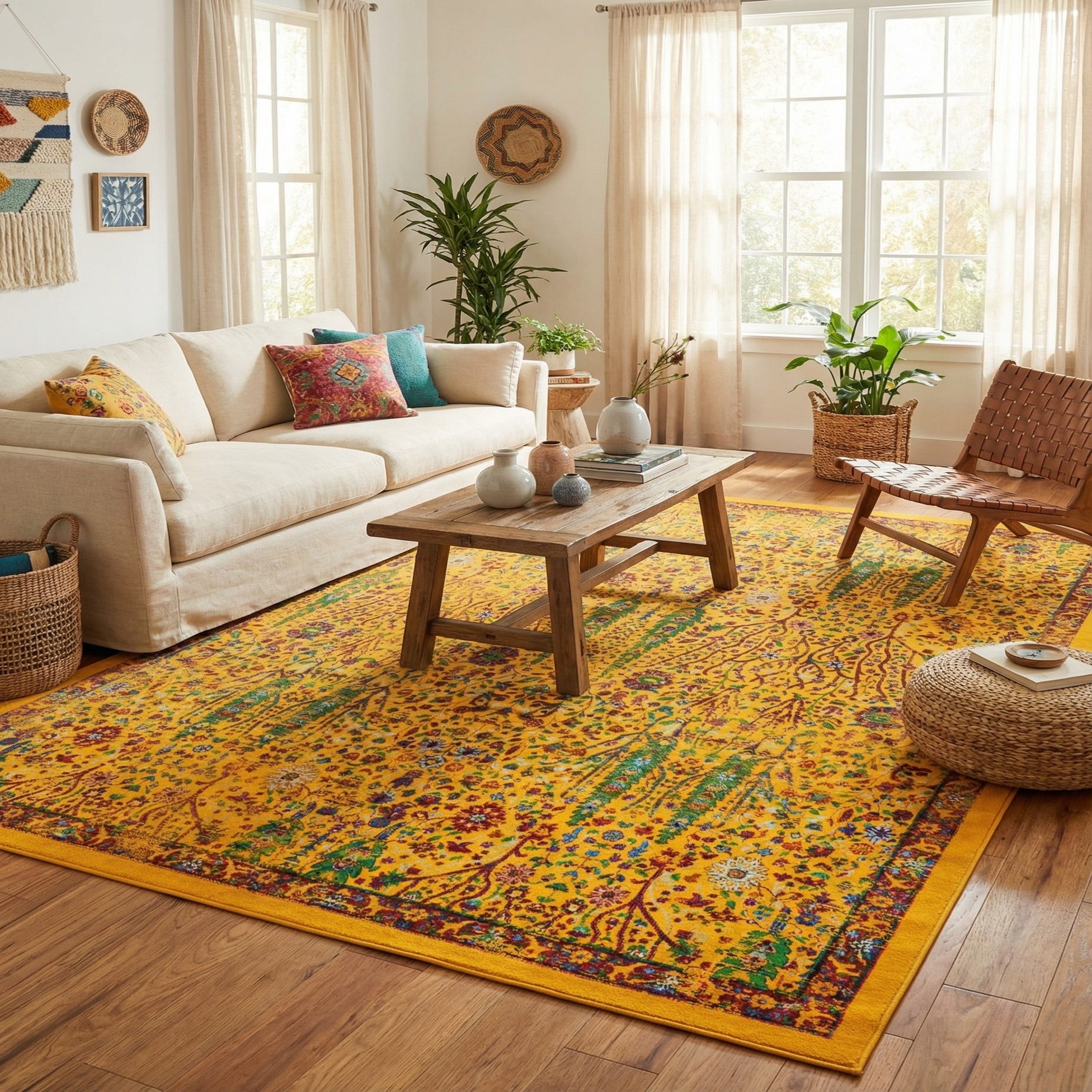 Primary color is Yellow. Colors in this rug include: Yellow, Blue, Ivory, Red, Green.