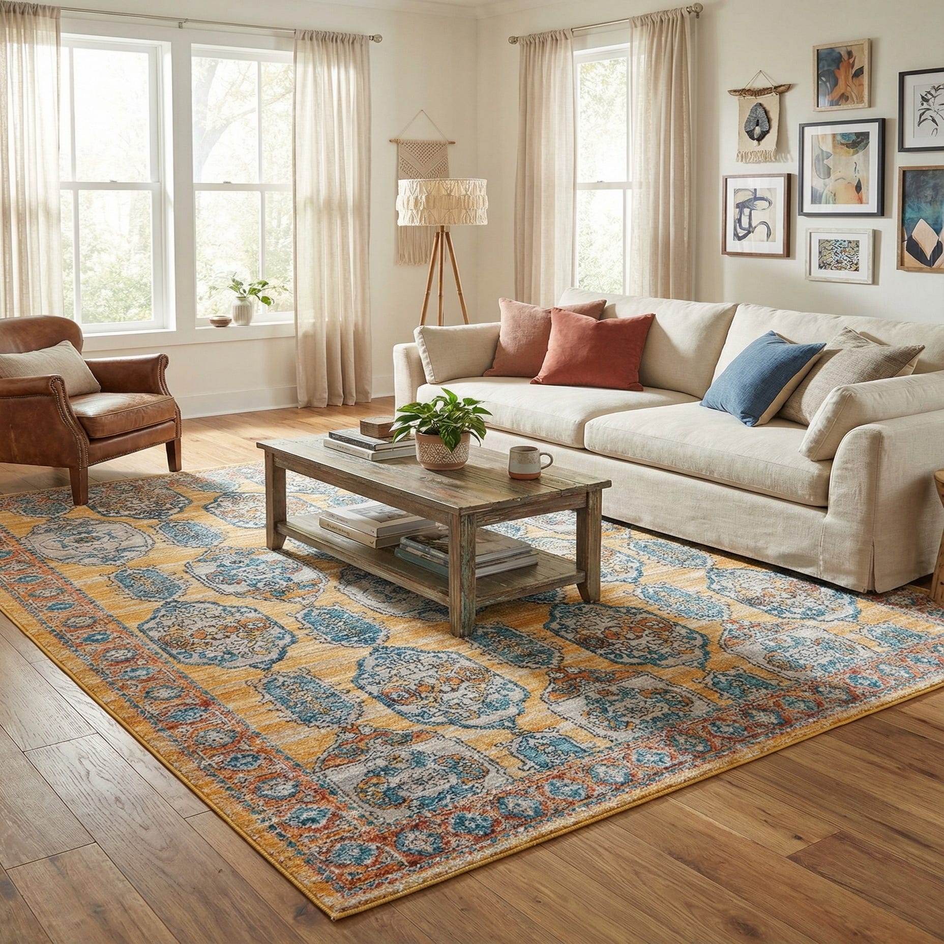 Primary color is Yellow. Colors in this rug include: Yellow, Blue, Ivory, Light Blue, Orange, Rust Red, Terracotta.
