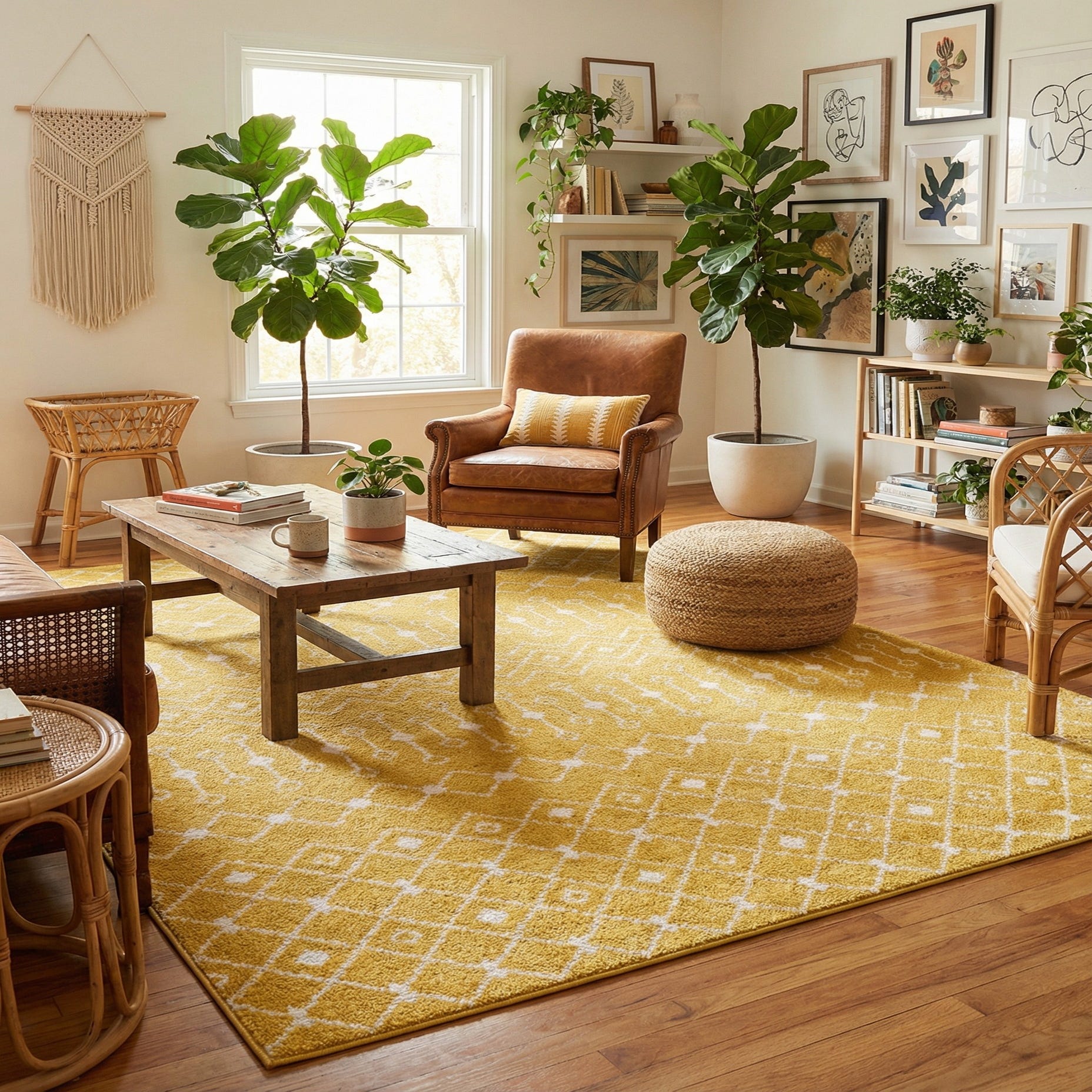 Primary color is Yellow. Colors in this rug include: Yellow, Ivory.