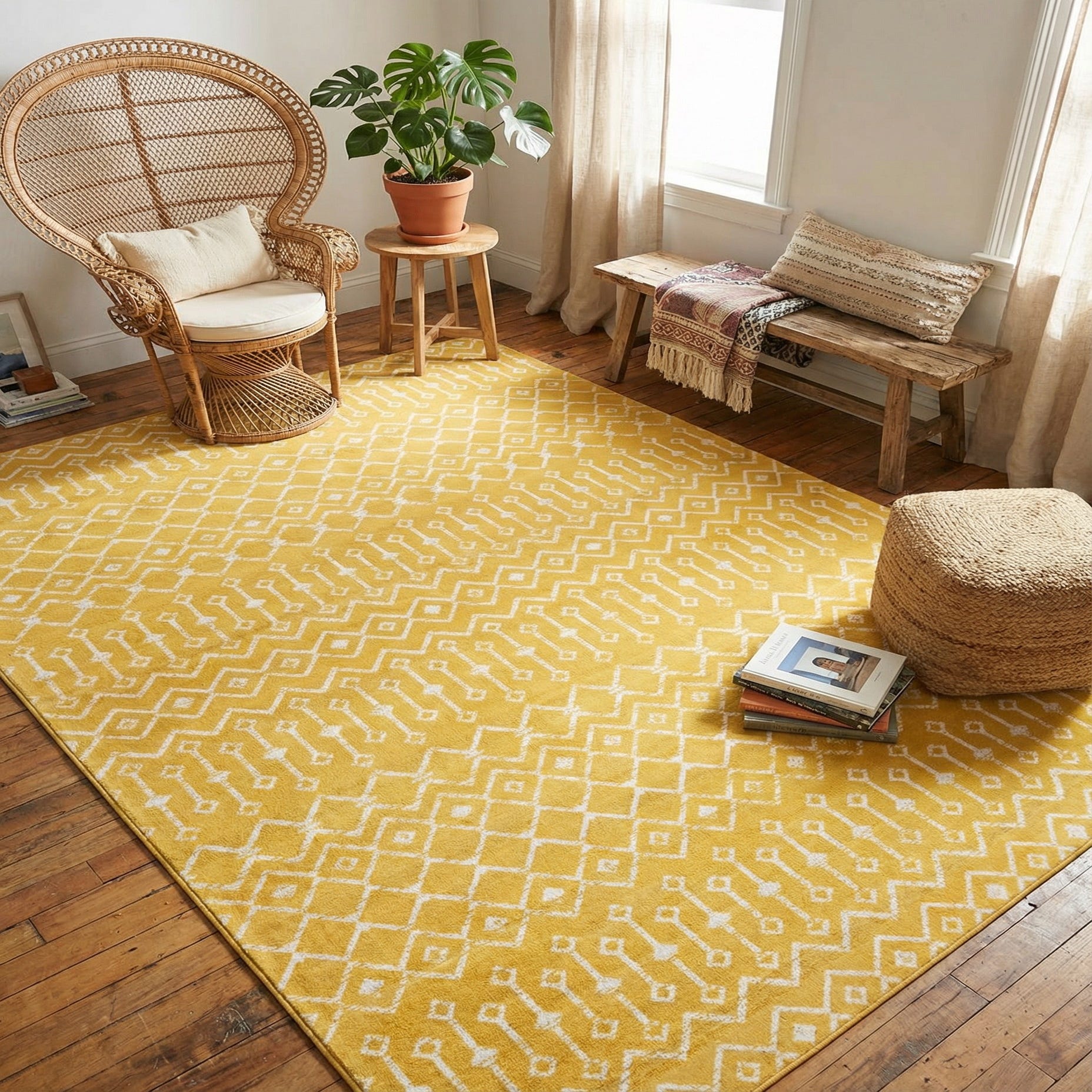 Primary color is Yellow. Colors in this rug include: Yellow, Ivory.