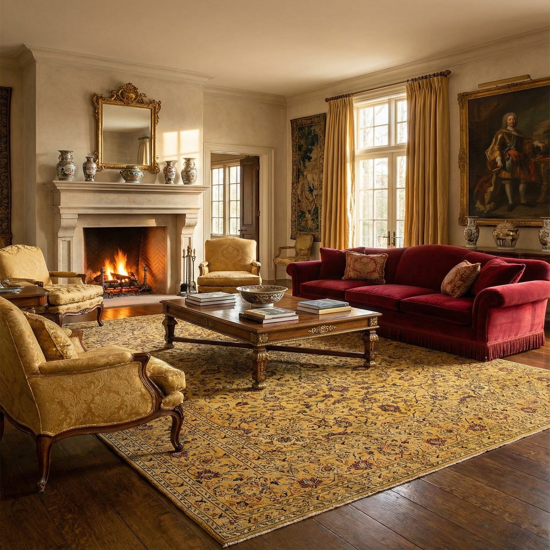Primary color is Yellow. Colors in this rug include: Yellow, Yellow, Dark Blue, Brown, Red, Grey.