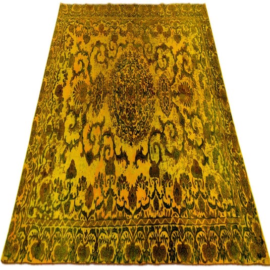 Primary color is yellow. Colors in this rug include: yellow, Brown.