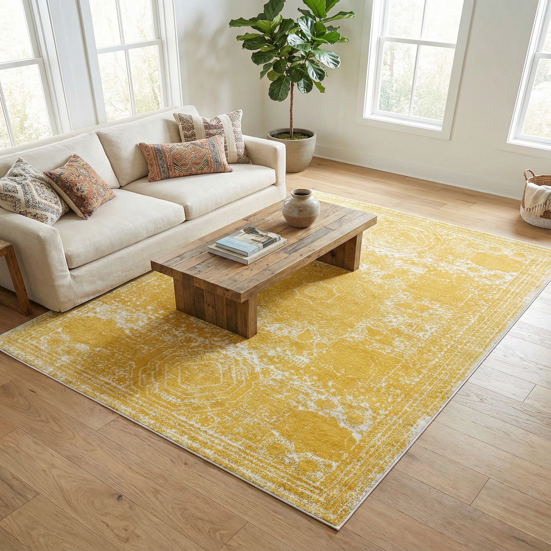 Primary color is Yellow. Colors in this rug include: Yellow, Ivory.