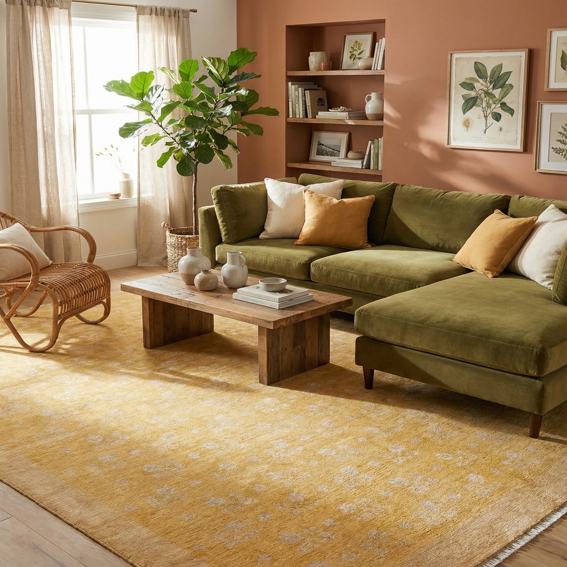 Primary color is Yellow. Colors in this rug include: Yellow, Beige.