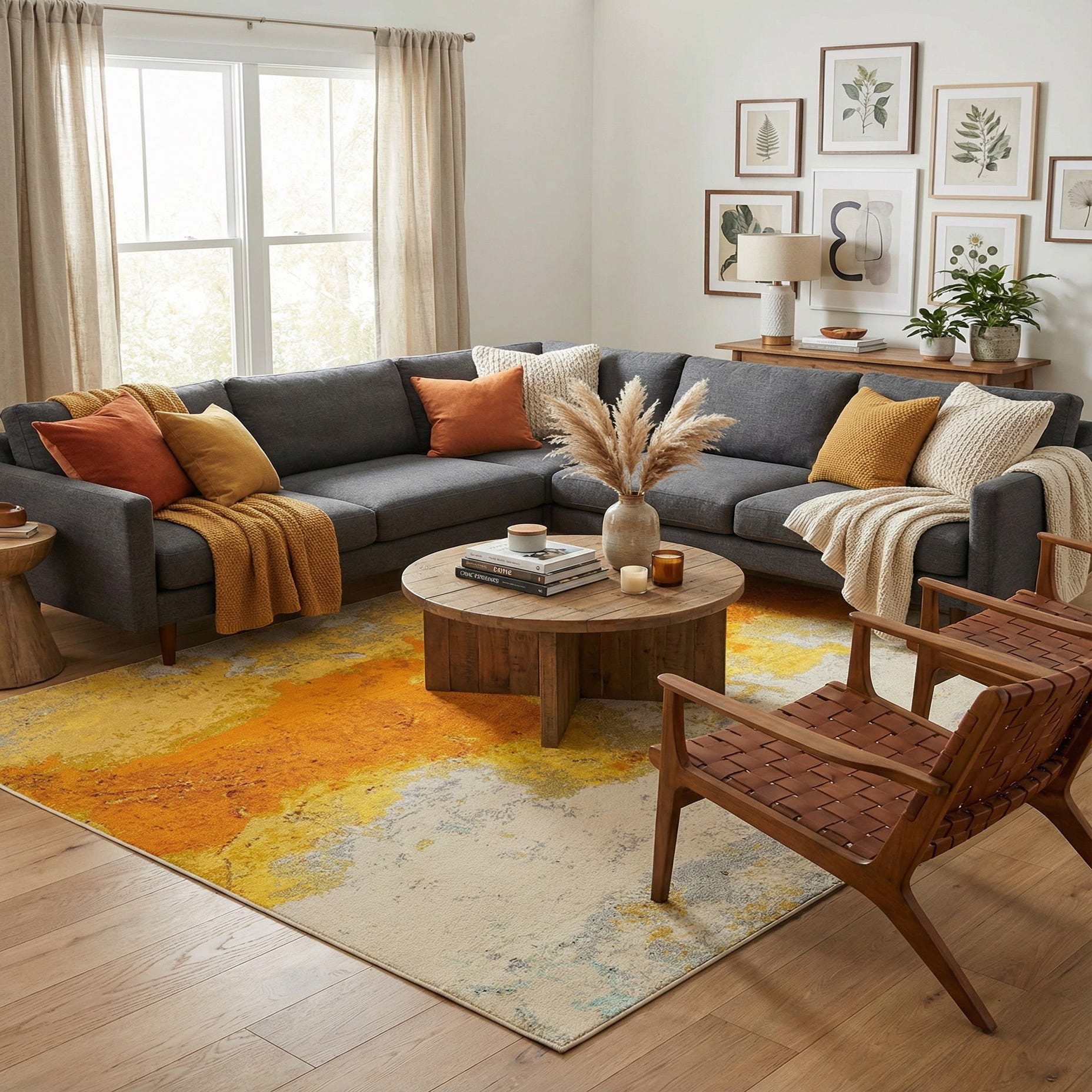 Primary color is Yellow. Colors in this rug include: Yellow, Orange, Gold, Beige.