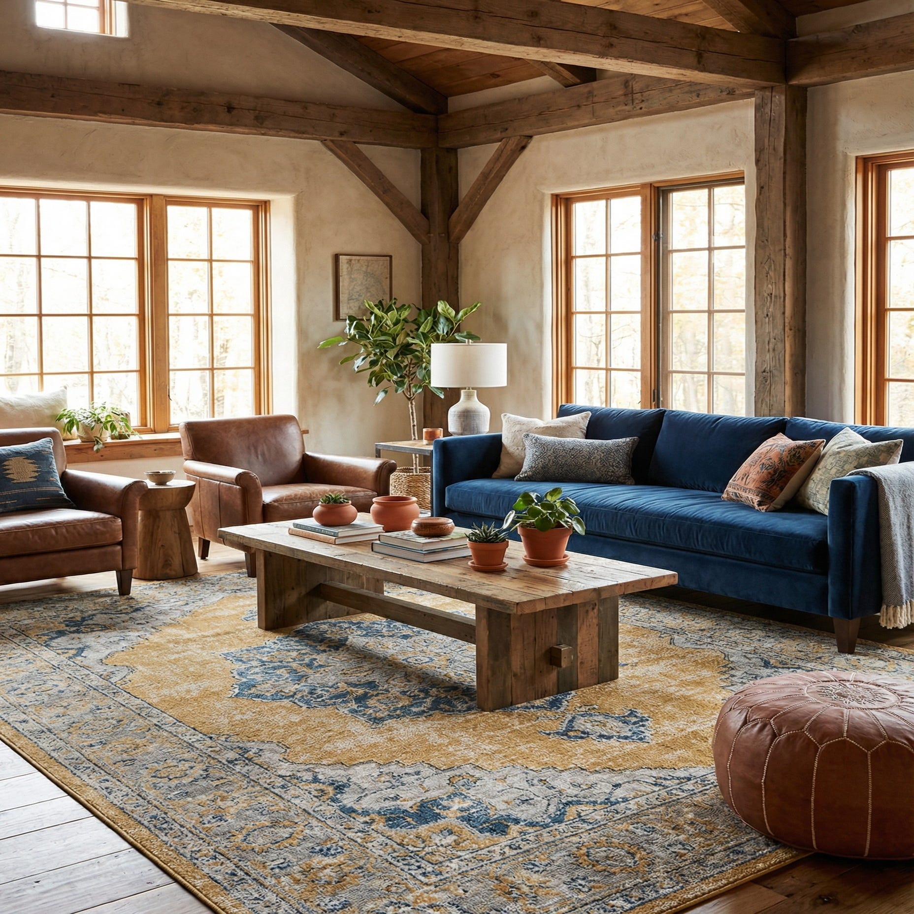 Primary color is Yellow. Colors in this rug include: Yellow, Blue, Ivory, Light Blue, Orange, Rust Red, Terracotta.