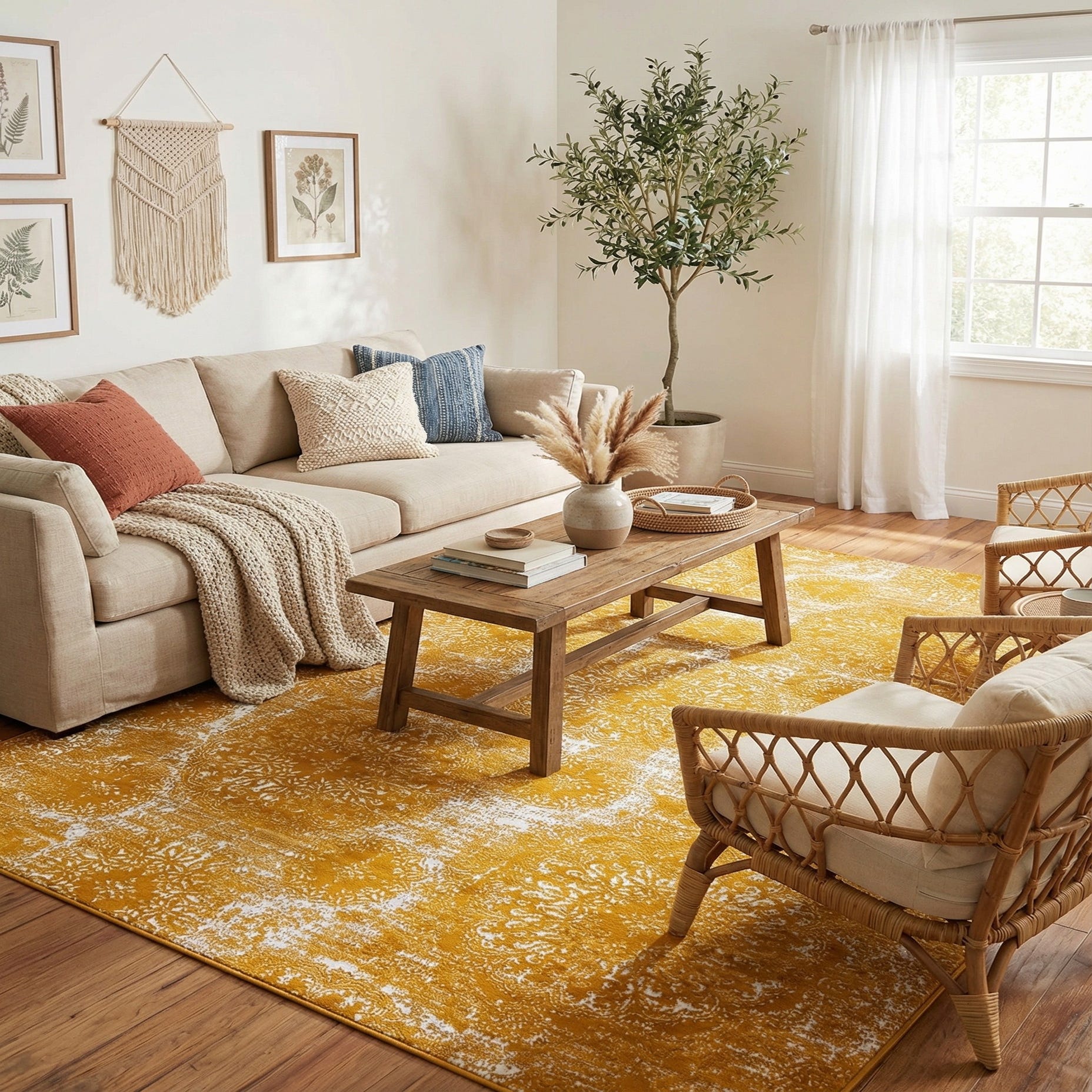 Primary color is Yellow. Colors in this rug include: Yellow, Ivory.