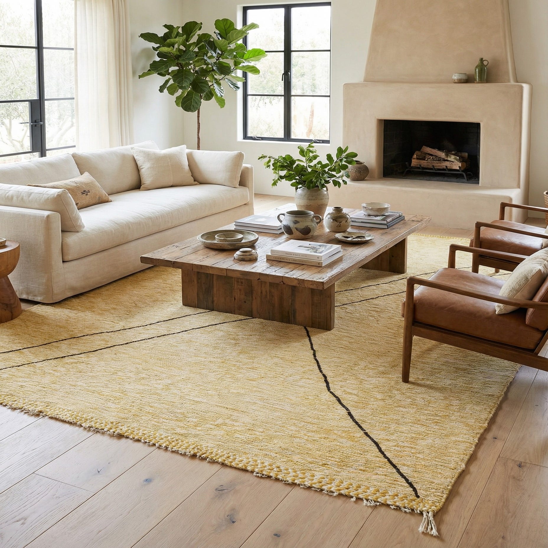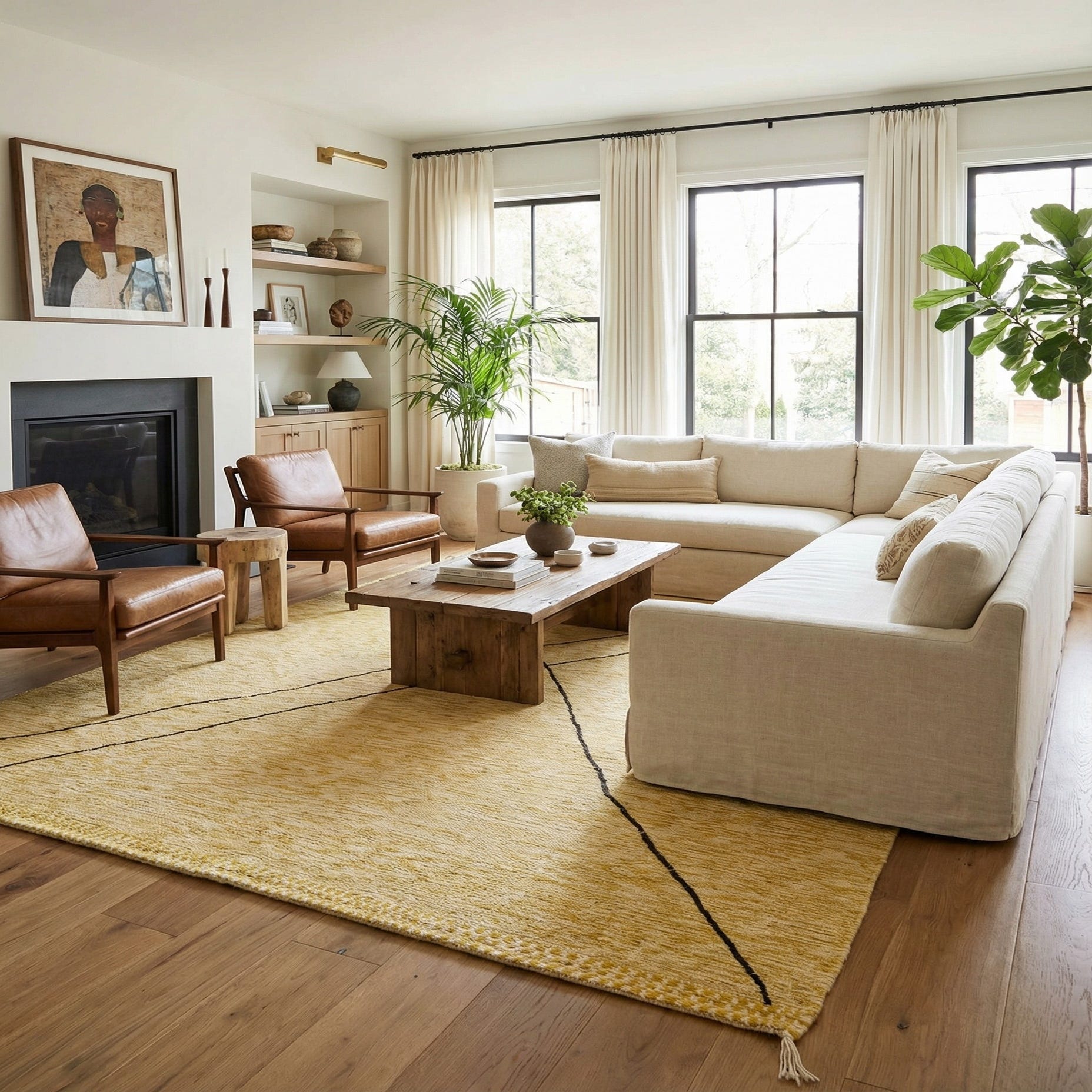 Primary color is Yellow. Colors in this rug include: Yellow, Black, Ivory.