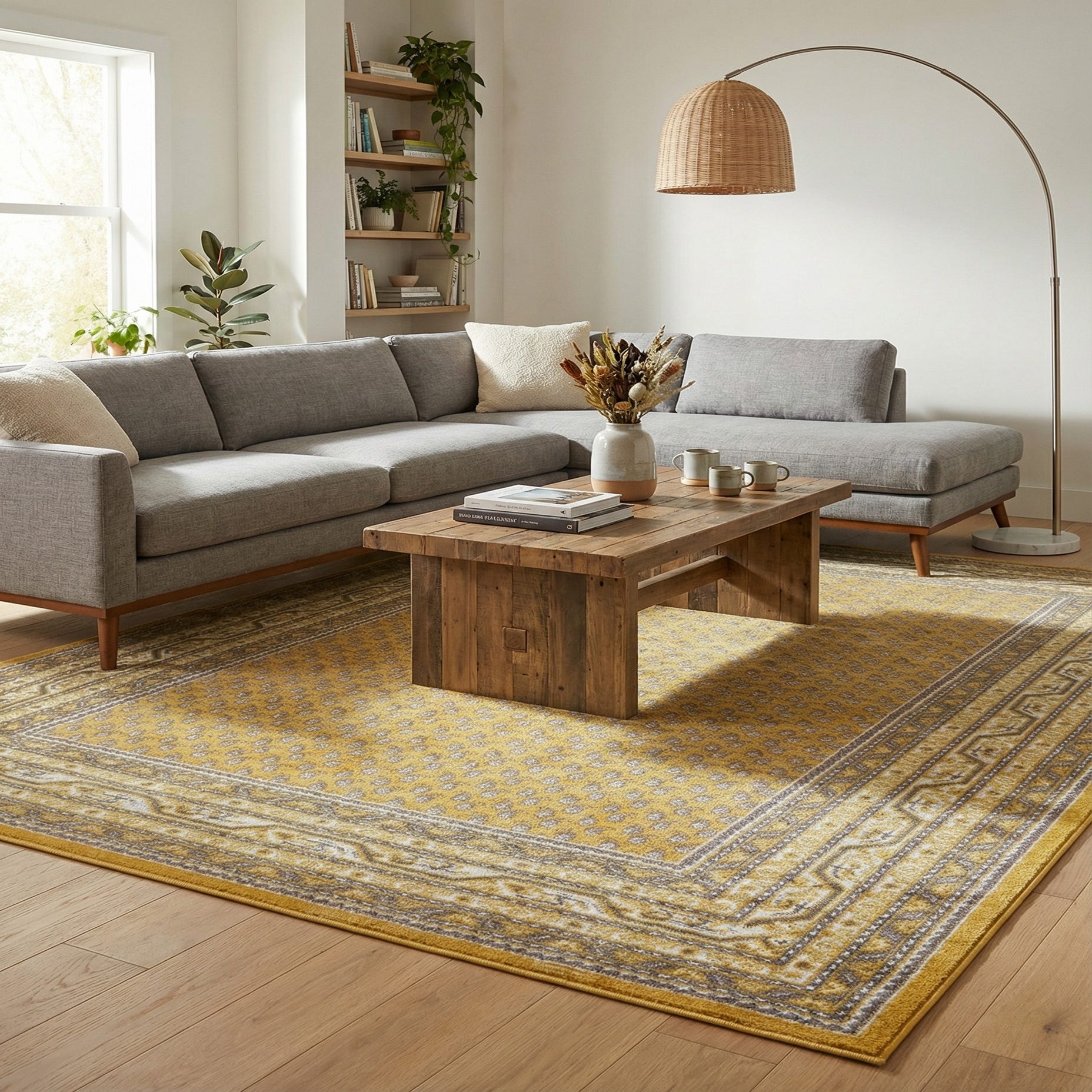 Primary color is Yellow. Colors in this rug include: Yellow, Gray, Ivory, Light Brown.