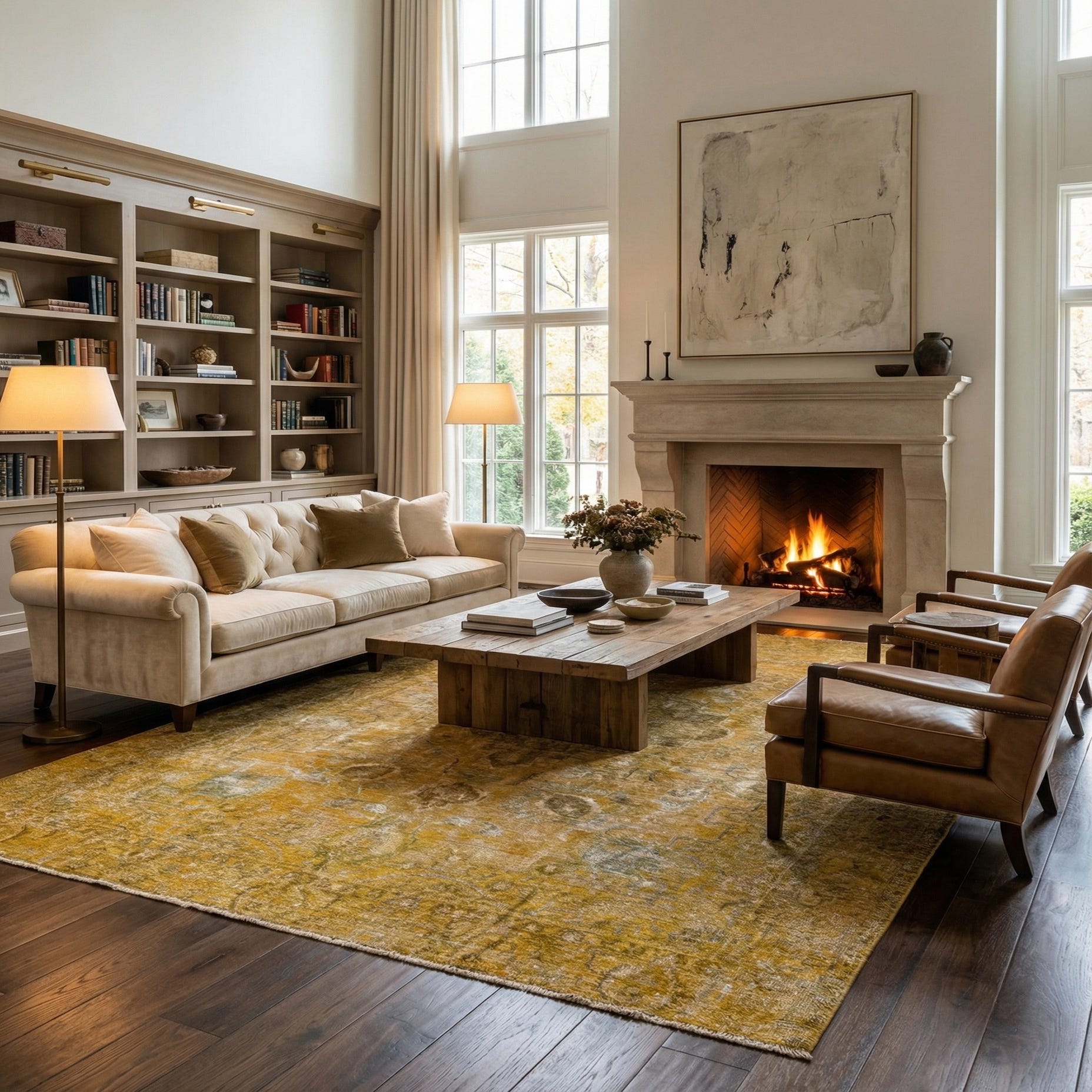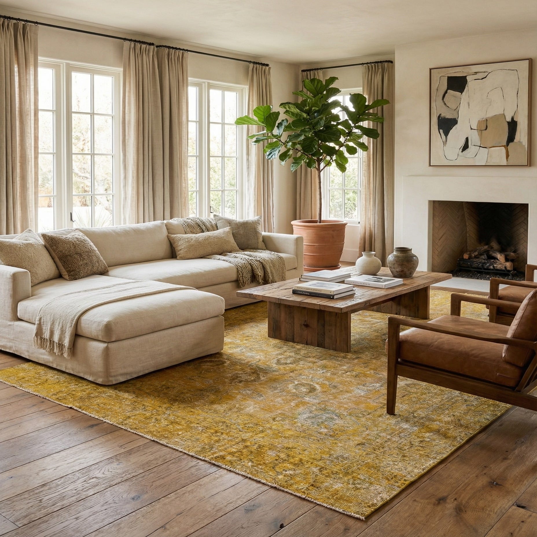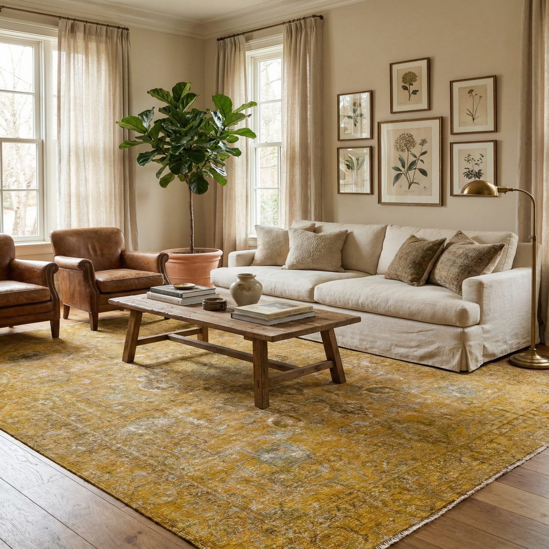 Primary color is Yellow. Colors in this rug include: Yellow, Olive, Ivory.