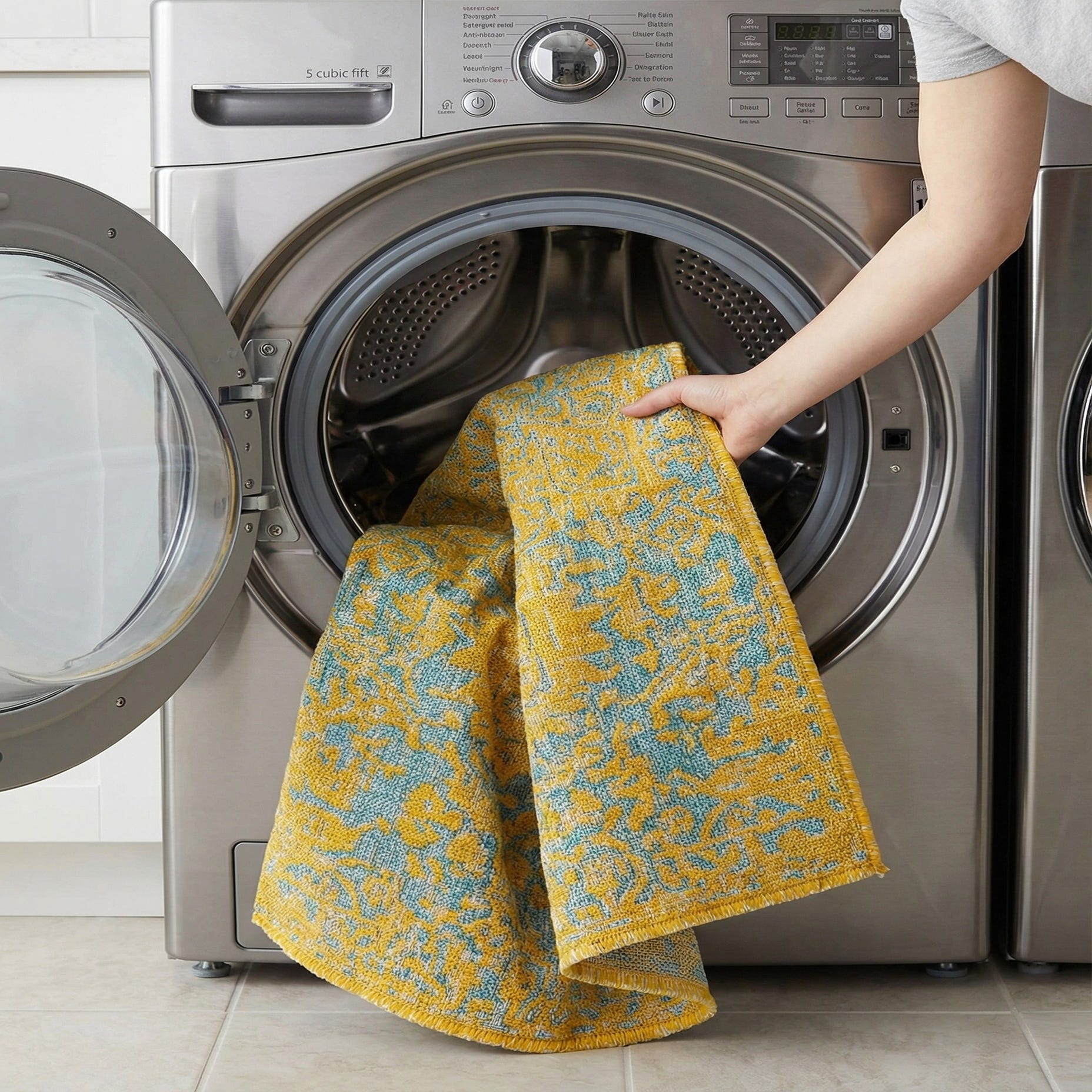 Primary color is Yellow and Aqua. Colors in this rug include: Yellow and Aqua, Blue.