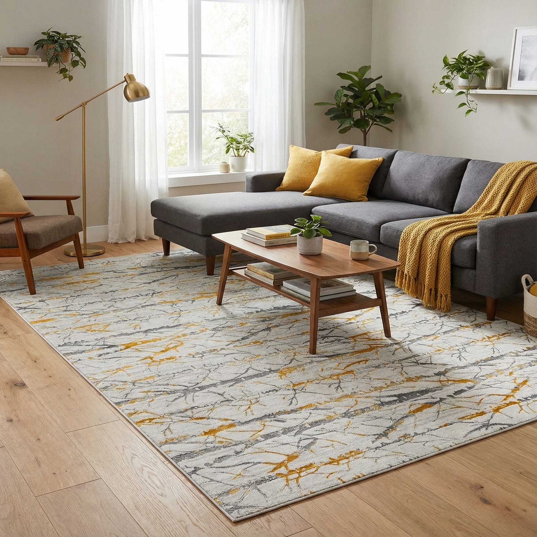 Primary color is Yellow and Gray. Colors in this rug include: Yellow and Gray, Ivory.
