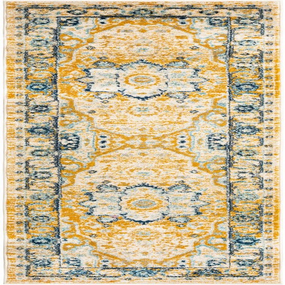 Primary color is Yellow Gold. Colors in this rug include: Yellow Gold, Ivory, Light Blue, Navy Blue, Teal.