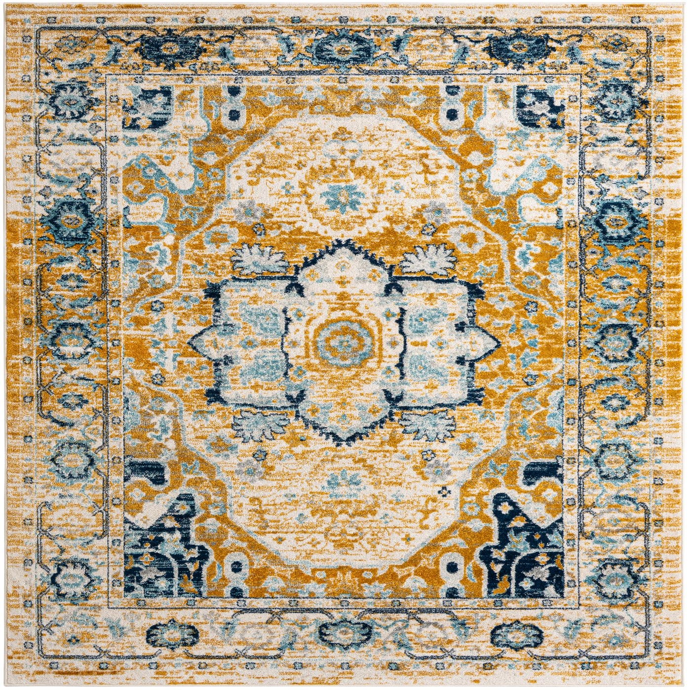 Primary color is Yellow Gold. Colors in this rug include: Yellow Gold, Ivory, Light Blue, Navy Blue, Teal.