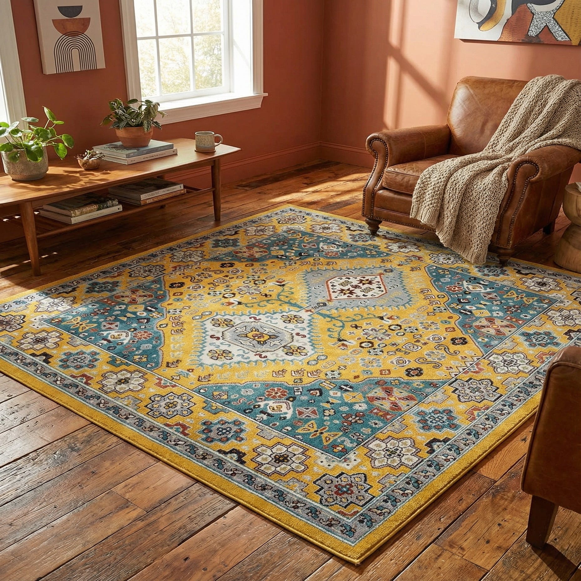 Primary color is Yellow Gold. Colors in this rug include: Yellow Gold, Gray, Ivory, Red, Light Blue.