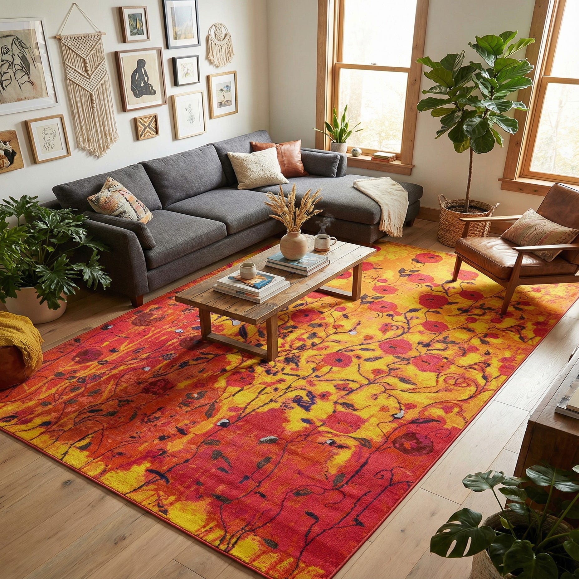 Primary color is Yellow. Colors in this rug include: Yellow, Light Blue, Navy Blue, Orange, Puce, Red.