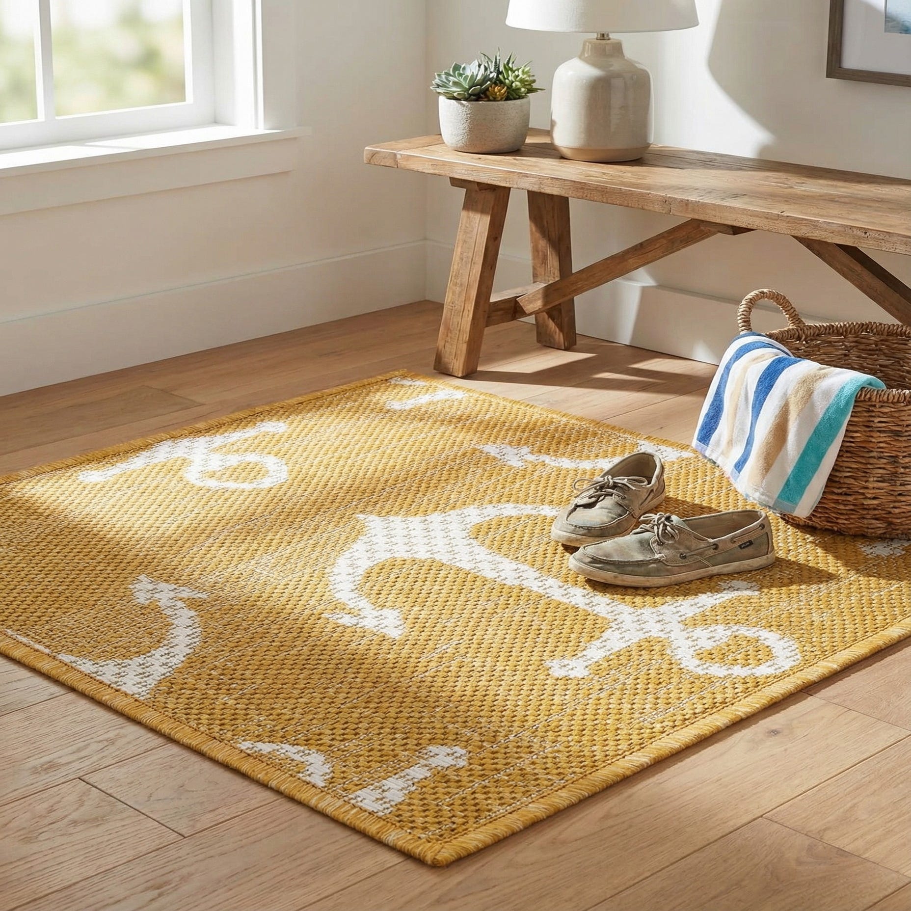 Primary color is Yellow. Colors in this rug include: Yellow, Ivory.